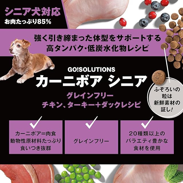 【厳選した食材で、美味しくお悩みを解決】20年以上のペット栄養の専門知識と厳選した安心食材。美味しく健康的にお悩みを解決する最適なレシピ。それがGO!SOLUTIONです。<BR>【お肉たっぷりの高タンパク・低糖質フード】タンパク質の85%が動物性原材料を使用。チキン・ターキー・ダックなど7種類のお肉、お魚でシニア犬の健康に。お肉が好き、関節ケアが気になる、筋肉を維持して引き締まった体型を目指したい、多彩な食材から栄養を取りたい、そんなお悩みに。<BR>【栄養や消化に考慮したフルーツ・野菜・ハーブも充実】免疫機能をサポートする20種類のフルーツの組み合わせで美味しさと栄養バランスを整えることを目指しています。更に健康な腸内環境と良好な消化をサポートするプロ・プレバイオティクス、14種類のハーブを配合。<BR>【安心・安全の厳選レシピ】グレインフリー、グルテンフリー、副産物・人工添加物(合成保存料・香料・着色料)不使用。<BR>【シニア/体重管理用・レギュラー粒タイプ】グルコサミン+コンドロイチン配合で関節をサポート。よく噛んで食べられる丸形のレギュラー粒タイプ(約10-13mm)です。*新鮮素材を使用しているため、季節によって粒の形・大きさにばらつきがあります。