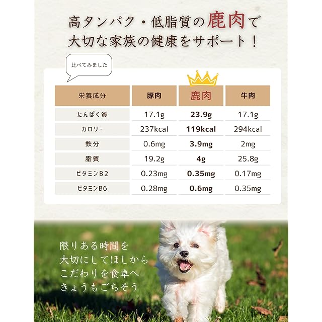 <h1><strong><b>鹿のお肉できょうもごちそう!</b></strong>犬の食事</h1> <h2><strong>おすすめの家族</strong></h2> 大好きな鹿肉がメインのフードを与えたい!<br> 国産で良質なものを与えたい!<br> 美味しいものを与えたい!<br> アレルギー対策をしたい!<br> <h2><strong>ごちそうのこだわり</strong></h2> 長野県/北海道産の野生の鹿肉が主原料 野生動物は自然の中を駆け巡るため、無駄な贅肉がなく良質なタンパク源となってくれます<br> 副タンパク源に高タンパク・低脂質のタラを使用、消化にやさしく、子犬やシニア犬にうれしい<br> 小麦グルテンフリー(不使用)、炭水化物には大麦・玄米を使用、ゆっくり消化されるため、食物繊維が大腸まで運ばれ、善玉菌のエサとなってくれます <br> 総合栄養食:主食とともにお水を与えていれば、健康維持に必要とされる栄養が摂れます。AAFCOの栄養基準に対応している犬の餌です。<br> わんちゃんに不必要な添加物はなし、香料・着色料・合成酸化防止剤は不使用で無添加ドッグフードです <br> 袋を開けると、タラやかつお節の出汁の良い香りがします<br> <h2><strong>栄養成分</strong></h2> たんぱく質 24.1% 以上<br> 脂質 9.4% 以上<br> 粗繊維 1.2% 以下<br> 灰分 6.5% 以下<br> 水分 10.0% 以下<br> 代謝エネルギー 349kcal/100g
