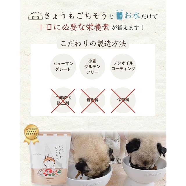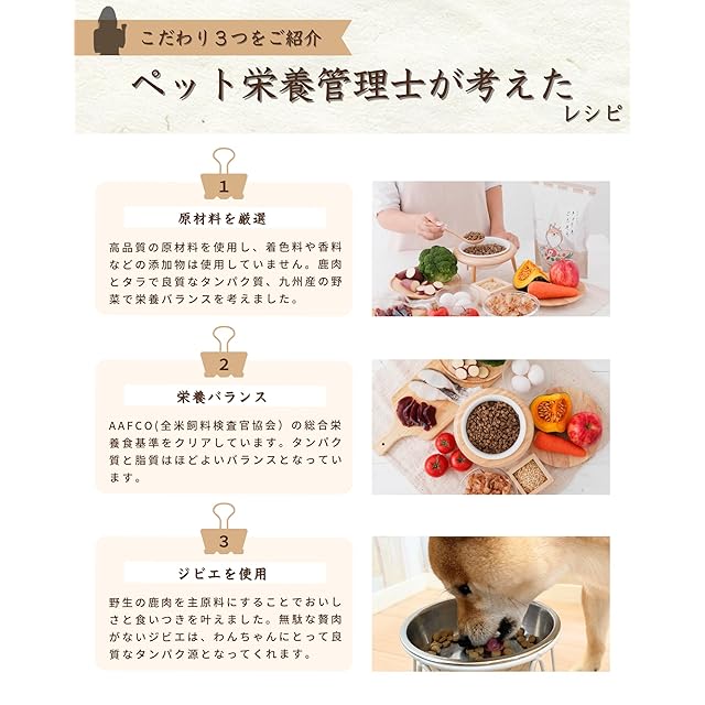 【1日に必要な栄養素】「鹿のお肉できょうもごちそう」と水だけで、ワンちゃんに必要な1日の栄養素がしっかりと摂れる総合栄養食。AAFCOの基準をクリアしています