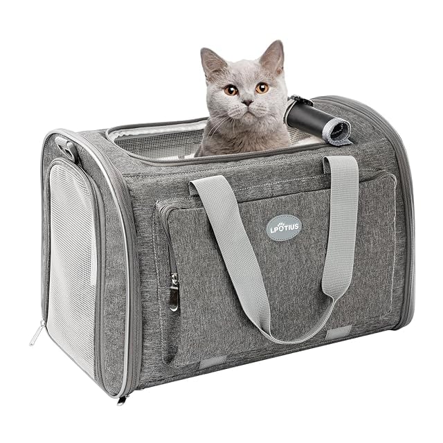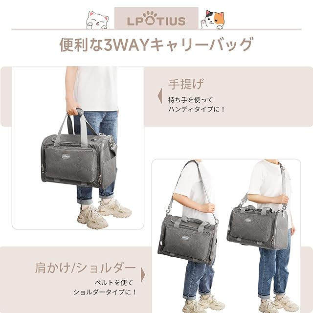 LPOTIUS ペットキャリー バッグ 折り畳み 2way 猫 小型犬 キャリーバッグ 軽量 3面通気 洗える 猫 キャリー 犬用キャリーバック 飛び出し防止リード付き ペット用 キャリーケース ベルト脱着可能 お出かけ 車載 旅行 通院 電車移動 災害避難に最適 耐荷重8KG (グレー)