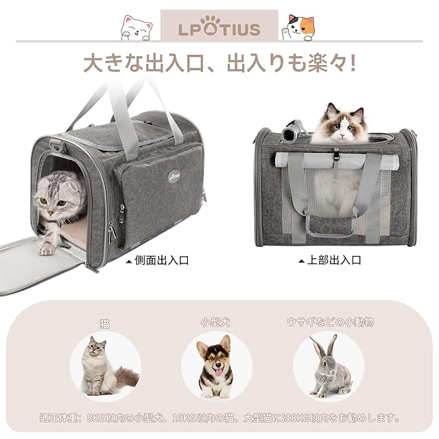 商品名:LPOTIUS ペットキャリー バッグ 折り畳み 2way 猫 小型犬 キャリーバッグ 軽量 3面通気 洗える 猫 キャリー 犬用キャリーバック 飛び出し防止リード付き ペット用 キャリーケース ベルト脱着可能 お出かけ 車載 旅行 通院 電車移動 災害避難に最適 耐荷重8KG (グレー)