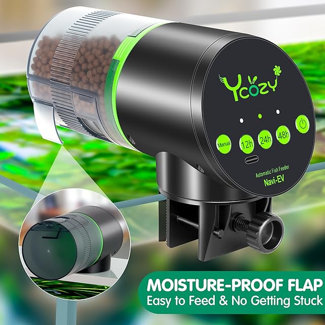 Ycozy 自動給餌器 魚 メダカ 自動餌やり機 210ML大容量 オートフィーダー 熱帯魚 観賞魚 金魚 亀 餌やり機 魚 静音 給餌器 水槽 えさやり器 防湿設計 取り付け簡単 配給量15段階調整可能 360°回転 充電式