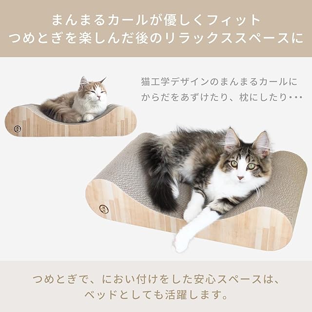【猫工学デザインのまんまるカールのつめとぎベッド】 猫工学に基づいたまんまるカールが、猫の柔らかなからだに優しくフィットします。 つめとぎとしてはもちろん、ベッドとしてもお使いいただけます。