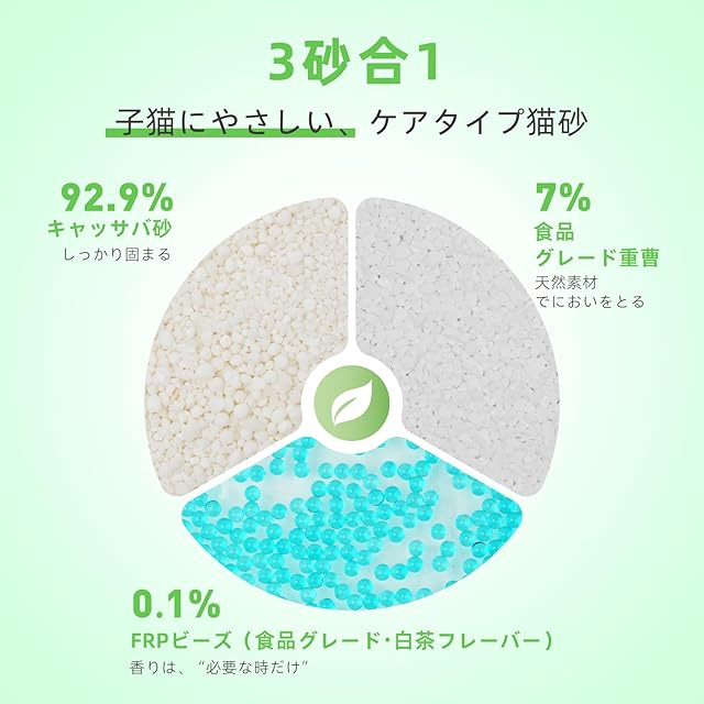 Zutto Nyan 3in1キャッサバミックス猫砂 は、子猫・シニア猫・病中病後の猫など、特別なケアが必要な猫ちゃんのために開発されました。99.9%が食べられるグレードの天然成分(キャッサバ+重曹)で構成され、香料や刺激物は一切不使用。粒子は細かくやわらかいため、足ざわりが優しく、力の弱い猫でもスムーズに砂をかけられます。吸水力が高く、わずか3秒でしっかり固まり、軟便でも底にこびりつかず掃除が簡単です。さらに、水分に反応してほんのり香る白茶フレグランスビーズと重曹のW消臭・抗菌効果で、48時間ニオイを抑え、空気を清潔に保ちます。本製品は水洗トイレに流せず、システムトイレには非対応ですが、可燃ゴミとして処理可能です。粒子が軽いため飛び散りやすい傾向があり、猫の体調回復後は他の猫砂と混ぜて使うのもおすすめです。
