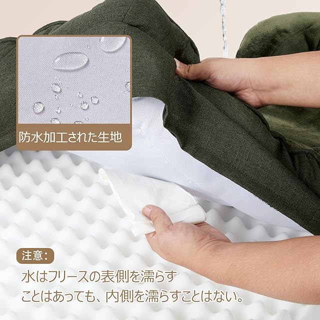 防水加工生地:ポリエステル生地の間に防水シートを挟み込んでおり、犬用ベッドを清潔で乾いた状態に保ちます。ただし、リネン部分の両側は防水ではありません。