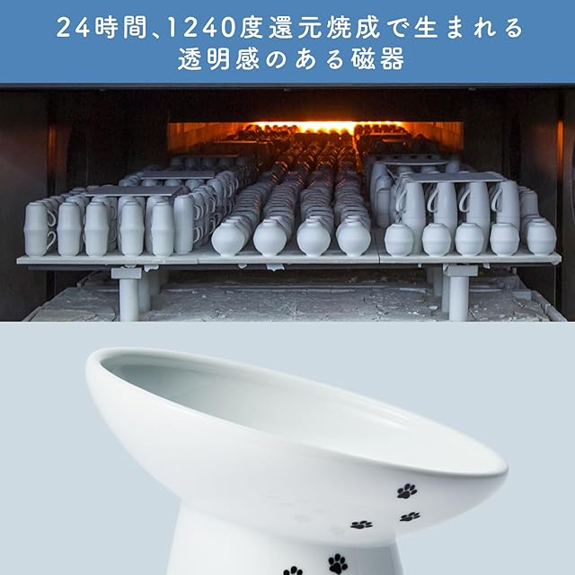 【脚付かつ広めのお皿なので、ヒゲが当たらずに自然な姿勢で食事が出来、吐き戻しの軽減にも配慮】 猫は比較的食道がまっすぐな動物のため、食道に溜まった食事が戻りやすい傾向にあります。高さのある脚付食器で自然で負担の少ない体勢で食事ができるので、吐き戻しや嘔吐を軽減してくれます。 さらに、広めのお皿にすることで、ヒゲが当たったり汚れたりするのを嫌がる猫や、マズルが短めの猫、食事の際にヒゲや毛が汚れやすい長毛種の猫にもおすすめです。