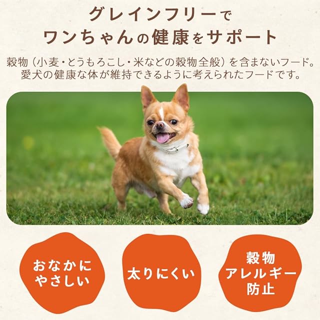 グレインフリーでワンちゃんの健康をサポート。グレインフリーとは穀物(小麦・とうもろこし・米などの穀物全般)を含まないフード。愛犬の健康な体が維持できるように考えられたフードです。