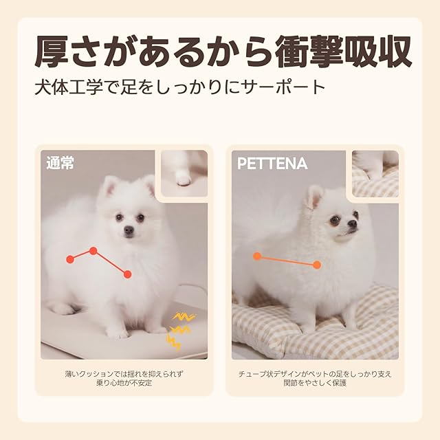 【愛犬の関節をやさしくサポート・犬目線の快適設計】PETTENAの自社開発によるペットカート用クッションは、最新の「犬体工学」に基づいた快適設計を採用。優れたクッション性により、関節や筋肉への負担をやわらげ、大切な愛犬の身体をやさしく守ります。約10cmの厚手インナーと高密度な縫製が、走行時の衝撃をしっかり吸収し、移動中のストレスを最小限に抑えます。