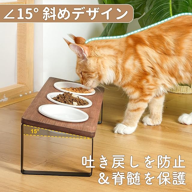 【商品特性】<br> ● 少し斜めな角度(15°)で食べやすくなり、胃腸が弱い猫には最適。<br> ● 上質な天然素材<br> 上質の天然バンブーを採用、防水処理加工で防水、防菌能力が優れ、カビを生えにくくなります。<br> ● 陶製のお皿がお手入れ簡単<br> 外せる陶製のお皿三つセット、スープなどキャットフードを入れても簡単に洗い取れます。いつも食器の清潔を保って、猫ニキビなどの皮膚の病気を避けます。<br> <br> 【商品仕様】<br> 竹製スタンド×1;<br> 陶製ボウル(直径14cm)×3<br> 【適用対象】<br> 全種類のネコ;<br> 小型犬;<br> 他の哺乳類動物;<br> 【アフターサービス】<br> 当社の製品はすべて品質があり、商品の品質から組立方法まで、使用中何か質問がありましたら、注文履歴の「出品者に連絡」から、お気軽にお問い合わせください!!