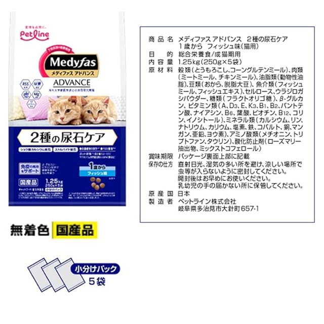 商品名:メディファスアドバンス 2種の尿石ケア 1歳から フィッシュ味 【シュウ酸カルシウム/ストルバイト/国産/アルミ小分け」 1.25kg(250g×5)x6(ケース販売)