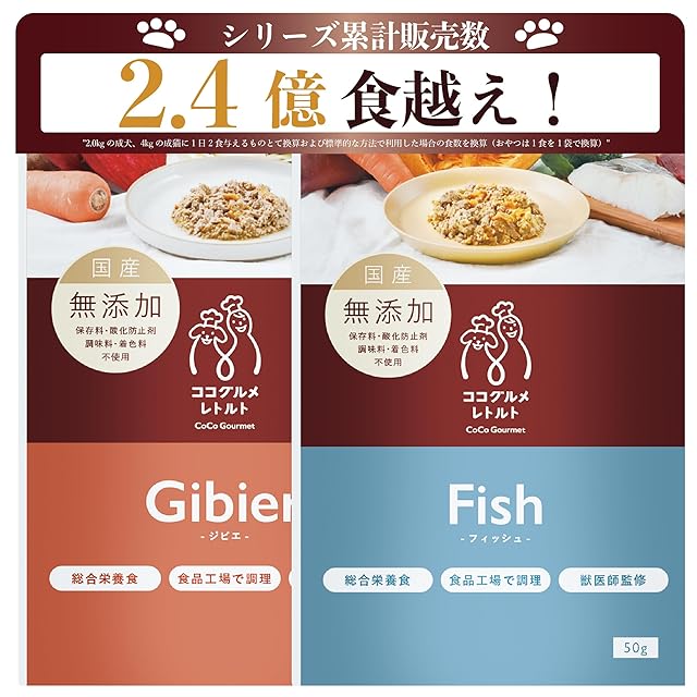 ココグルメ・レトルト (50g×2パック,フィッシュ,ジビエ) 獣医師監修 手作りドッグフード 総合栄養食 国産 無添加 グレインフリー ウェットフード 常温保存 お試し 災害 備蓄