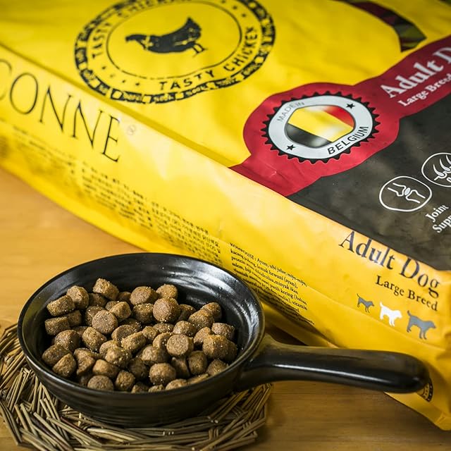 商品名:ブラバンソンヌ 大型犬の成犬用 チキン 内容量:10kg 原産国:ベルギー 賞味期限:商品上部記載(EXP 日/月/年) 保存方法:直射日光を避け、涼しく乾燥した場所に保管してください。 【原材料】チキン、サツマイモ、レンズ豆、エンドウ豆、動物性油脂(チキン由来)、加水分解チキンタンパク質、サーモンオイル、亜麻仁、乾燥チコリー(フラクトオリゴ糖、イヌリン)、ビタミン類(A、D3、E)ミネラル類(鉄、銅、亜鉛、マンガン、ヨウ素、セレニウム)、セルロース、ビール酵母、乾燥ニンジン、乾燥リンゴ、酸化防止剤(ローズマリー抽出物、α-トコフェロール)、乾燥クランベリー、乾燥ナシ、乾燥ホウレンソウ、グルコサミン、コンドロイチン、ユッカ抽出物【成分】 粗タンパク質26%以上、粗脂肪14%以上、粗灰分8%以下、粗繊維3.5%以下、水分9%以下、オメガ6 脂肪酸2.14% 以上、オメガ3 脂肪酸0.76% 以上、カルシウム1.2%、リン0.7%、カリウム0.6%、ナトリウム0.2%、マグネシウム0.1% 【代謝エネルギー】 348kcal/100g 【商品説明】 ベルギーで生産しているドッグフード(成犬用総合栄養食)です。 天然素材にこだわり、ヒューマングレードの鶏肉や魚など、厳選されたヨーロッパ産の最高品質の食材を使用しています。 FEDIAF(欧州ペットフード工業会連合)およびAAFCO(米国飼料検査官協会)の栄養基準を満たしており、着色料、香料、化学保存料、防腐剤は一切使用しておりません。 【注意・保存方法】製品の製造管理には万全を期していますが、万一、当社の製造管理上の原因による品質不良がありました場合は、同等の新しい製品とお取替えさせていただきます。 ●開封後はしっかりと密閉し、なるべくお早めにご使用ください。 ●直射日光を避け、涼しく乾燥した場所に保管してください。 ●人間が食べても問題ない品質の材料を使用していますが、誤食防止のため小児の手の届かない場所に保管してください。 ●体調に変化がみられた場合は、直ちに使用を中止し、獣医師に相談してください。