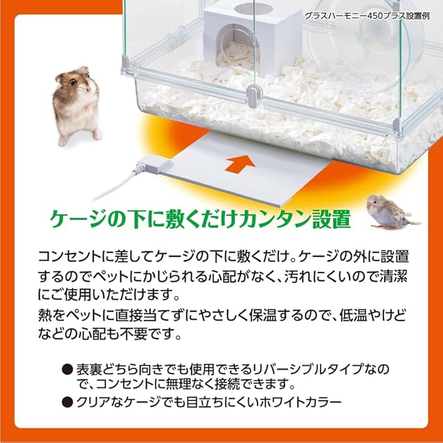 【ペットを守る安全設計】 ●丈夫な6層構造設計で、ヒーター層がしっかり保護されているので傷つきにくい。特許取得のPTC塗料を含浸焼成した特殊ファイバーを採用。●自動でヒーター温度を一定に保てる、自己温度制御(PTC)ヒーターを採用。異常発熱時は電流ヒューズが通電を遮断するので、もしもの時も安心。 【ケージの下に敷くだけ簡単設置】コンセントに差してケージの下に敷くだけのカンタン設置。ケージの外に設置するのでペットにかじられる心配がなく、汚れにくいので清潔にご使用いただけます。熱をペットに直接当てずにやさしく保温するので、低温やけどなどの心配も不要です。