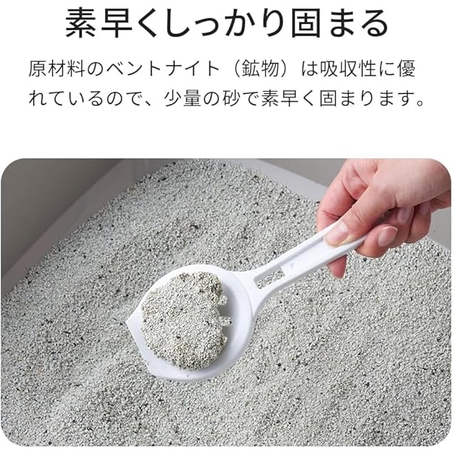 ✅シリカゲル・ゼオライト・活性炭という消臭力に優れた3つの素材をバランスよく配合することで、 気になるニオイを徹底的に排除します。原材料のベントナイト(鉱物)は吸水性に優れているので、少量の砂で素早く固まります、 また、凝固力が非常に高いので、固まりは崩れることなく簡単にすくえて快適です。