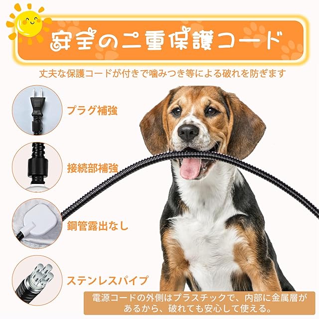 【噛み癖対策 &感電など多重保護 】全ての部分は鋼管で保護され、露出部分はなく、噛むや引っ張るから完全に防ぐ。接続部補強➕コントロラー補強➕全身鋼管保護で露出なし➕プラスチックなラセン管➕高品質電源コードで5重保護で全方位でペットの安全を守る。噛み癖と感電の危険が一切の心配がなし。
