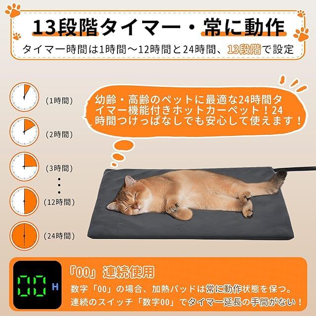 【14段階:1~12時間タイマー➕ 24時間タイマー➕ 常に動作】ご必要に応じて適切な時間(1/2/3...12H)を1時間単位で12段階で設定することができます。このペット用ホットカーペットには新たに24時間のタイマー機能も搭載しており、24時間後には自動的に電源が切れるため、安心して長時間使用が可能です。これにより、類似製品よりも細かくタイマー設定と幅広い選択肢が可能になります。時間を設定せずに連続使用したい場合は、タイマーを「00」に設定すれば常に動作になります。設定した時間に達した後、再びオンにするのを忘れる心配はありません。寒がりの愛犬や愛猫にぴったりの防寒対策品です。