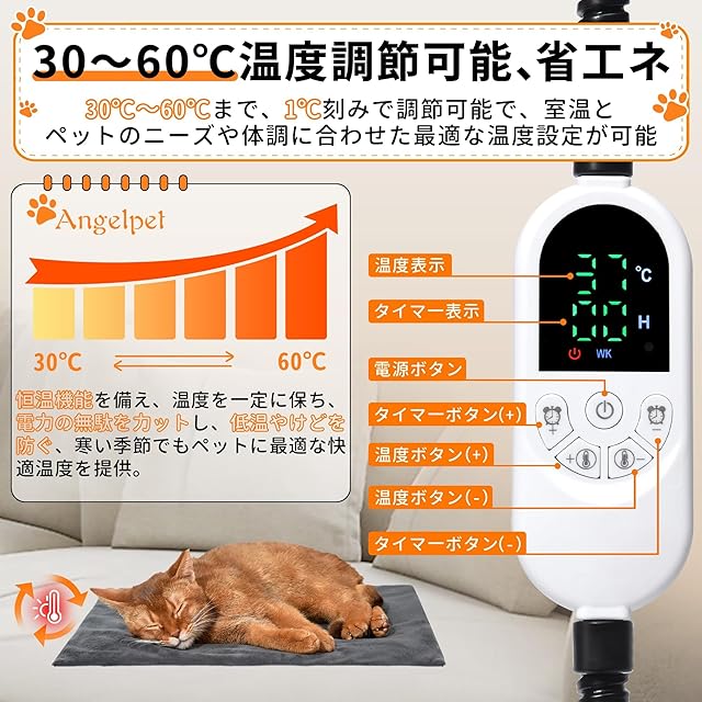 商品名:Angelpet ペット用ホットカーペット【ペット専門家監修】 30℃~60℃温度調節 14段階タイマー機能 ペット用ヒーター 猫 犬 小動物 ホットマット ヒーターマット 加熱パッド 過熱保護 防水難燃性 コード全て鋼管で保護 噛み癖対策 厚手 柔らか 寒さ対策 カバー2枚付き (Mサイズ(45*45))
