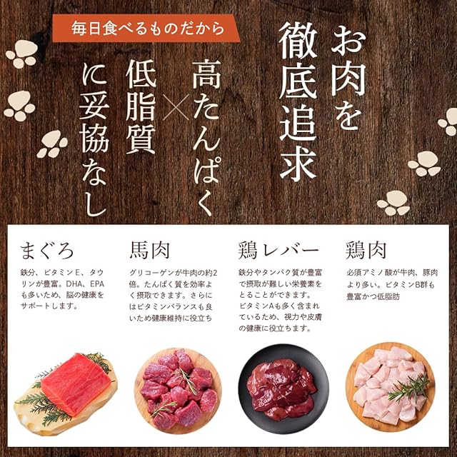 【ヒューマングレード品質のドッグフード】ヒューマングレード品質・合成着色料、合成保存料不使用 人間の食品と同レベルの国内専門工場で製造しており 余計な添加物、合成保存料・着色料は不使用です。 【主原料は全て国産の食材を使用】厳選素材を豊富に使用 厳選食材を使用し、 タンパク質を効率的に摂取できる馬肉や鉄分、ビタミンEが豊富なまぐろを使用しております。 非常に栄養素が高く『奇跡の貝』と呼ばれている緑イ貝や、栄養価の高い国産野菜など バランス良く配合されております。 【厚さ2.5mmの小粒サイズ&砕けやすい楕円形】食べやすい小粒設計 約9㎜×6㎜食べやすさを実現しました。 噛む力が弱いパピーやシニア犬にも与えやすく、口に運びやすいなど小型犬にメリットがいっぱいあります。 【 スーパーフードと言われる「緑イ貝」を使用】関節疾患の予防・関節炎症状の軽減効果、小型犬で多いとされる関節疾患の予防や症状を和らげる作用があります。 コンドロイチン、コラーゲン、ヒアルロン酸、オメガ3脂肪酸などの成分が含まれており、 皮膚ケアに効果のあるオメガ6脂肪酸の成分も含まれています。 【毛並み改善・涙やけ予防効果】 EPA・DHAが含まれており、食いつきの良い「馬肉」と「マグロ」を使用しています。 馬肉とマグロに含まれるEPA・DHAは、健康で美しい毛並みをキープしたり 、涙やけによる目元をケアする効果が期待できます。 抗炎症作用があるので、アレルギー性皮膚炎の緩和や抗癌作用など炎症を抑制する効果があり、視力の回復、維持にも効果が期待できます。 【うま味の効いた芳醇なかつおだしの香り】こだわりの香りと食いつき 袋を開けると香りが広がります。 少食・偏食気味の子も思わず飛びつく秘密は、ふんだんに使った国産かつお節を使用するため。 かつお節を使用しているので、ダシの香りがキープされます。