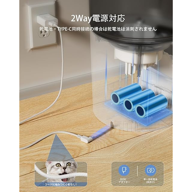 【2WAY電源 & 停電対策で365日安定稼働】AC電源+単1電池3本(別売)のダブル給電を搭載。災害時も給餌設定を記憶。