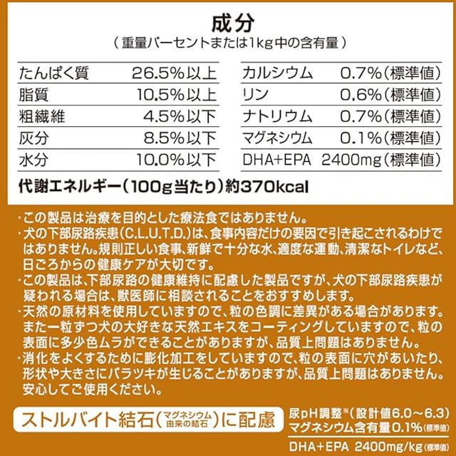 成分:たんぱく質26.5%以上 脂質10.5%以上 粗繊維4.5%以下 灰分8.5%以下 水分10.0%以下