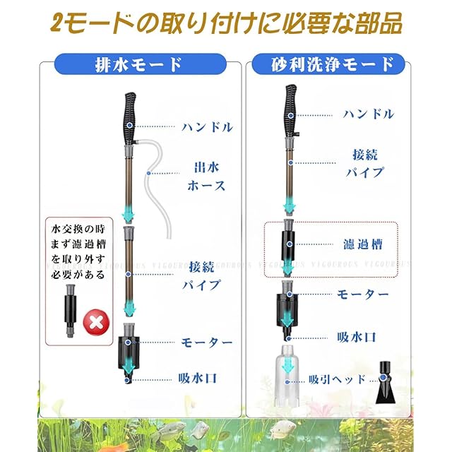 VIGOUROUS電動式水槽用水換えポンプは、水換え・砂利洗浄・汚れ掃除を一体化した3in1多機能タイプで、日常の水槽アクアリウム管理を簡単にします。本製品には2種類の専用ノズルが付属しており、用途に応じて使い分けが可能です。砂利掃除ノズルは、水槽の底砂に混ざった微細な汚れを効果的に吸い出すことができ、内部のフィルタースポンジにより、レイアウト用の砂利や石が吸い込まれるのを防止します。一方、吸水ノズルは、底に溜まった餌の食べ残しや魚のフンなど、大きなゴミをしっかりと吸引可能です。水流は調整可能で、効率よく水換え・清掃作業を進められるため、面倒な水槽メンテナンスをよりスムーズに行えます。