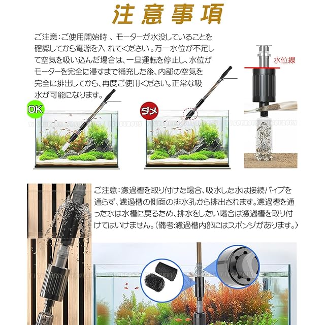 【充実の付属品セット&品質】モーター*1、接続パイプ*3、汚れ収集フィルター*1、ハンドル*1、砂濾過アダプター*1、ダクビル吸水ノズル*1、砂洗いカップ*1、ケーブル固定クリップ*3、USBケーブル*1、排水ホース*1、日本語説明書×1。さらに、1年間の品質付きで、初期不良や使用中の自然故障等の場合は商品交換と返品返金などのサービスを提供致いたします。万が一、商品について何か不明なところがあれば、是非遠慮なく気軽にお問い合わせください。