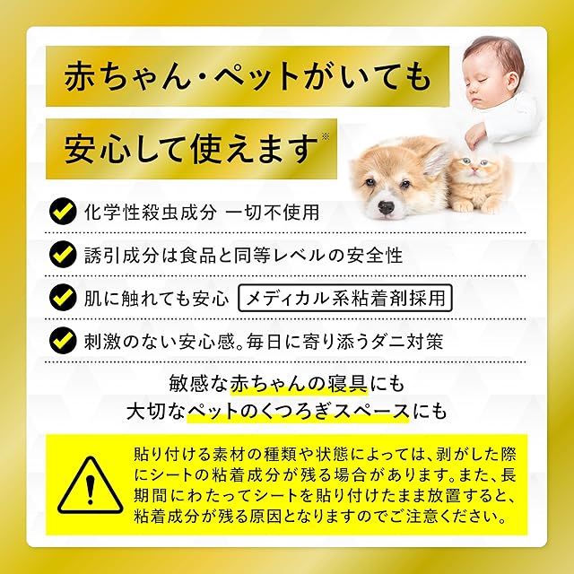 ✅従来にはなかった乾燥タイプのダニ捕りシートが新登場!20年以上の歴史がある衛生管理製品開発メーカー開発。独自開発のDNTECH-αと特許出願中のnano-DRY-Dを最大量配合させることで、ダニ捕りシートにダニを大量に誘きよせて一網打尽に。置くだけの乾燥タイプが、水分を多く持つダニに対してより効果的に働きます。化学性殺虫成分を一切利用していないので、子供やペットにも安心安全です。 ✅ダニの誘引試験では97.9%のダニの誘引に成功。ダニシートから放たれるDNTECH-αがダニを誘き寄せます。国内ダニトリシートトップレベルの誘引力です。匂いは設置しても気にならない匂いで、日々の生活もストレスフリーで過ごすことが可能です。 ✅独自成分のnano-DRY-Dが、ダニを二日で即乾燥。これまでのダニ捕りシートはダニを捕えてもダニが活動し続けることで排泄物や卵を産み、それらが外に出てしまったことも。しかし、乾燥タイプのダニ捕りラボは、80%以上が水分で含まれているダニを乾燥させることで2日で急速に弱体化させます。 ✅厚さわずか3.00mmの極薄設計。ポンっと置くだけでダニへの効果は3ヶ月持続。たった5秒もあれば、ベッドや押入れ、ソファなどあらゆる場所でダニ対策が可能です。