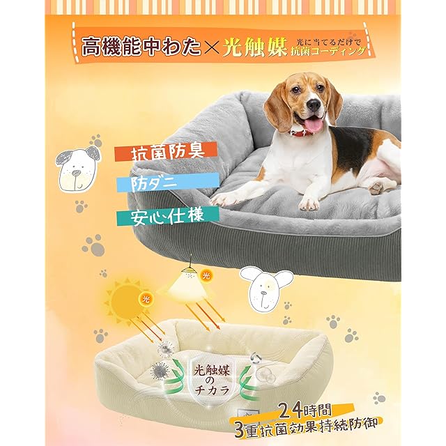 【高機能中わた・W抗菌防臭】ペットベッドは高機能中わた繊維を採用されて、細菌の繁殖を抑制し、防臭効果を発揮できます。同時に光触媒をコーティング加工も備えて、お部屋の明かりや常夜灯の光だけで触媒反応を起こす光触媒だから、消臭・制菌、防臭・防ダニ効果が長く続きます。