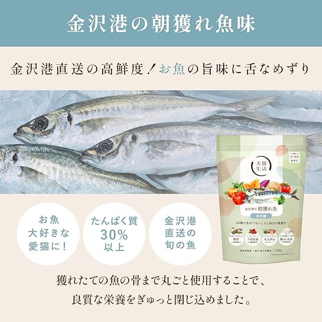 商品名:[犬猫生活] キャットフード 全年齢 [国産 無添加 獣医師共同開発 ノンオイル グレインフリー] 金沢港の朝獲れ魚味 (750gx1) | 総合栄養食/猫/ご飯/ドライフード