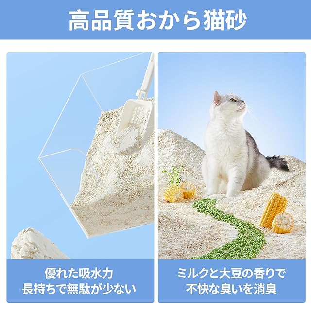 本製品はおから混合猫砂で、おから砂とデンプン砂の長所を融合しています。素早くしっかり固まり、崩れにくく、トイレの底に張り付かず、お手入れが簡単です。