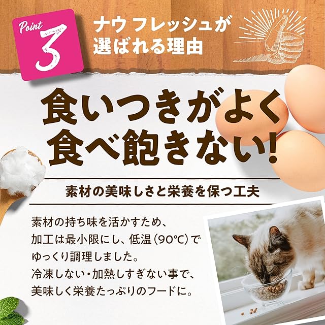 【100%フレッシュな生肉・鮮魚を使用】消化にやさしく美味しい、生(フレッシュ)の食材にとことんこだわり、乾燥肉やミートミールを使わない「100%」新鮮な生肉・鮮魚を使っています。