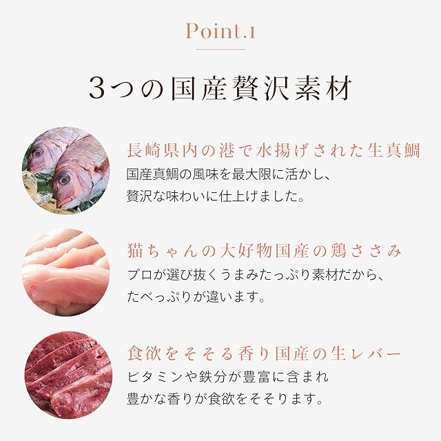 国産贅沢食材を使用:ねこちゃんの大好きな国産の鶏ささみ、長崎県内の港で獲れた生真鯛、食欲をそそる香りの生レバーを贅沢にMIXした国産無添加*のおやつです。お肉もお魚も国産のヒューマングレード素材を食材の目利きが産地で厳選しています。お肉とお魚のうまみがぎゅっと濃縮されており、ねこちゃんが喜ぶリッチで濃厚な味わいです。*保存料、着色料、香料