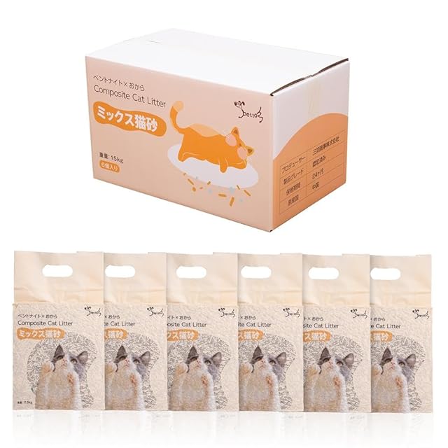 PETTOM 猫砂 ミックス猫砂 おから ベントナイトとおから 猫トイレ用品 混ぜる 脱臭 真空パック 飛び散らない トイレに流せる (2.5kg×6袋 淡ミルクの香り)