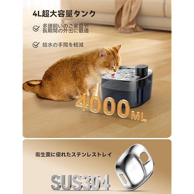 【4L大容量+304ステンレス貯水カバー】多頭飼いに最適な1週間分の給水量。食品級304ステンレストレイとABS本体で耐久性と安全性を両立。