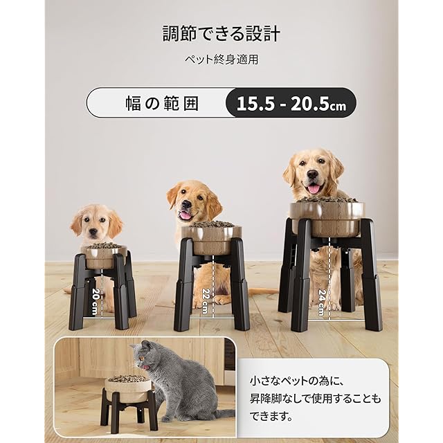【幅と高さが調節可能&終身適用】今市販しているスタンドのほとんどは、高さか幅しか調節できません。しかし、JUNSPOWフードボウルスタンドは、高さ13~24cm(脚付き)、幅15.5~20.5cmの調節が可能です。つまり、あらゆる形やサイズの犬食器に適しています。 また、簡単に調整できるように設計されています。 JUNSPOWのスタンド1つだけで、あなたの大切なペットの各成長段階に十分付き合えます。