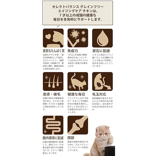 セレクトバランス グレインフリー エイジングケア チキンは、7才以上の成猫の健康な毎日を多角的にサポートします。 ■更新日時:2025/08/18 08:49:42