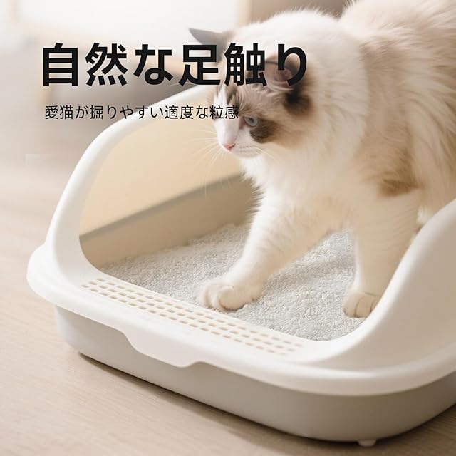 【粉が舞いにくいねこ砂】飛散しにくい小粒設計で早めにかたまり、粉塵になりにくいです。愛猫が日常的に粉塵を吸い込むのを減らし、猫ちゃんと飼い主の健康を守ります。