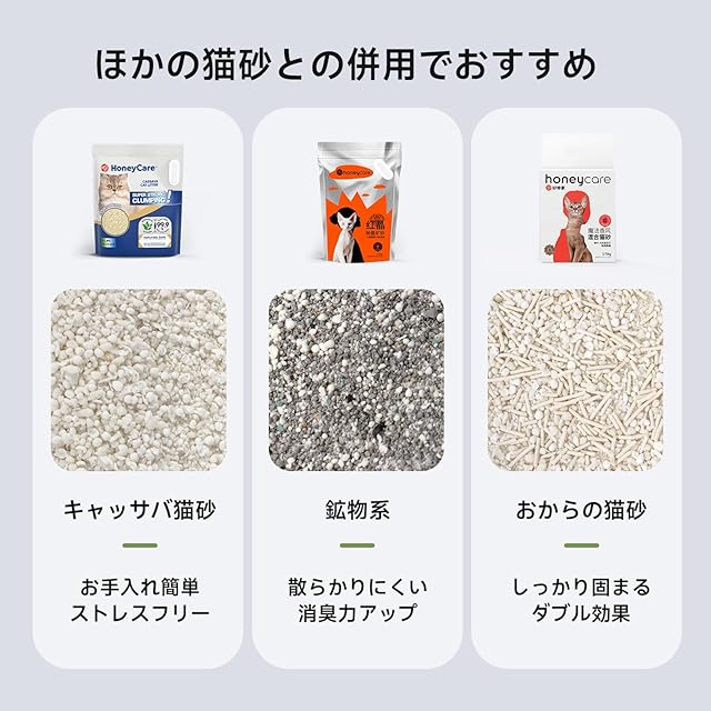 【天然素材で安心】HONEY CAREのキャッサバ製猫砂は自然由来のキャッサバでんぷん、コーンスターチ、コーンフラワーで作られており、無香料で環境にやさしいです。猫が誤って食べても安心です。
