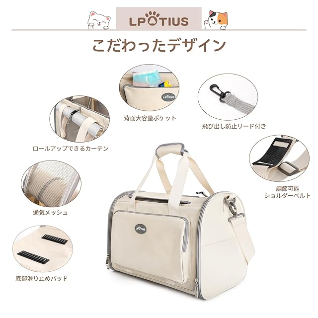 商品名:LPOTIUS ペットキャリー バッグ 折り畳み 2way 猫 小型犬 キャリーバッグ 軽量 3面通気 洗える 猫 キャリー 犬用キャリーバック 飛び出し防止リード付き ペット用 キャリーケース ベルト脱着可能 お出かけ 車載 旅行 通院 電車移動 災害避難に最適 耐荷重8KG (エクリュ)