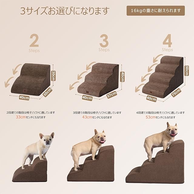 【2つのステップサイズ】この犬用階段には2つのステップと3つのステップがあります。2つのステップは約33センチの椅子/ソファ/ベッドに適しています。3つのステップは約43センチの椅子/ソファ/ベッドに適しています。