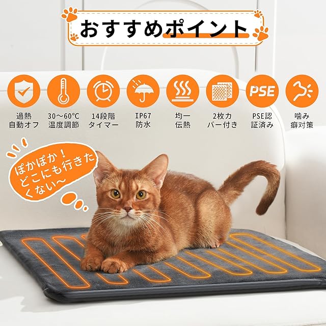 商品名:Angelpet ペット用ホットカーペット【ペット専門家監修】 30℃~60℃温度調節 14段階タイマー機能 ペット用ヒーター 猫 犬 小動物 ホットマット ヒーターマット 加熱パッド 過熱保護 防水難燃性 コード全て鋼管で保護 噛み癖対策 厚手 柔らか 寒さ対策 カバー2枚付き (Lサイズ(45*70))
