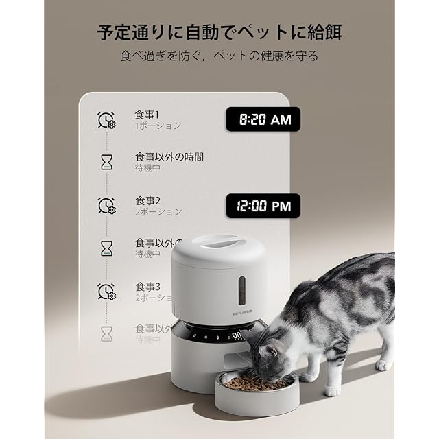 ⏰【定時定量 健康給餌】:1日は24時の範囲で1-6回の給餌設定が可能!毎回で1-50のポーションを設定できます。規則正しい時間に、少量ずつ、小分けに与えられる設定に。ペットの肥満、朝の空腹による嘔吐を防止でき、愛猫・愛犬にバランス良く、健康な食生活が提供できます。