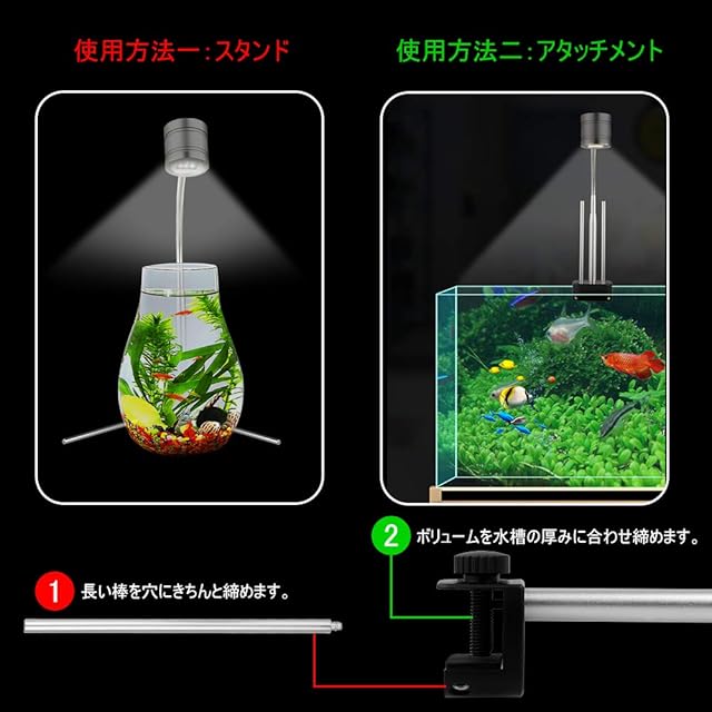 アタッチメント&スタンドの2WAY方式でフレームレス水槽、小型容器、枠付き水槽にも使用可能。スタイリッシュなアルミボディ!サンドブラスト処理+アルマイト加工で上質な質感を実現できています。
