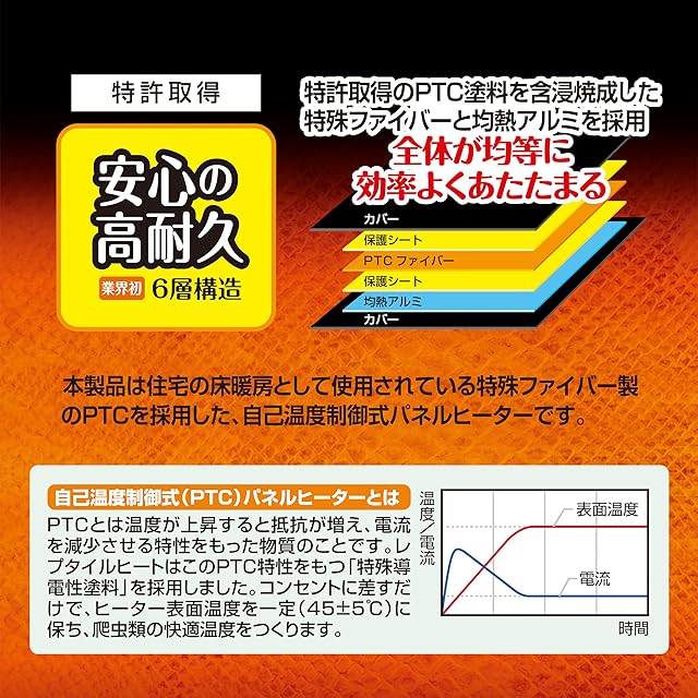 耐久性に優れ熱効率を高めた全体が均等に効率よくあたたまる新構造の爬虫類用パネルヒーター。特許取得のPTC塗料を含浸焼成した特殊ファイバーと均一アルミを採用