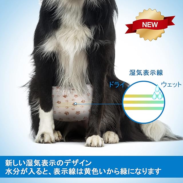 新しい湿気表示線のデザイン、ワンちゃんがオシッコをしたら、オムツが湿気を検出することができ、表示線は乾燥状態の黄色から湿気の緑へ変色します、おむつ専用のマジックテープを採用し、ワンコの体によって調整、ぴったり装着できます、ワンタッチテープで幅が広く、何度もつけ直しでき、ペットの体型にフィットしていつも快適、腹巻風なので、巻くだけで簡単に装着できます