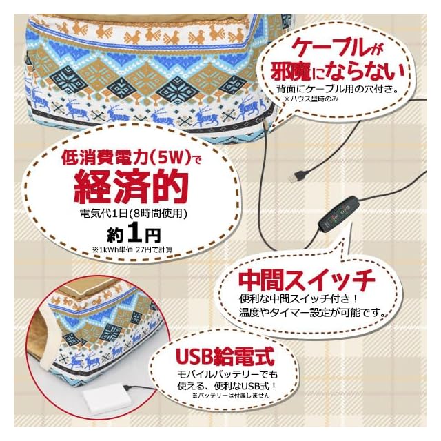 温度3段階・タイマー3種・保護回路搭載 USBヒーターマット付き! <br>ぽかぽかあったか 2WAY犬猫用ペットハウス<br><br>■USBヒーターマット付きあったかペットハウス!<br>寒い時期にぴったり!ペットが長時間リラックスできる、ちょうどいい温度のUSBヒーター付きペットハウス。体を覆うハウス型で中の温かさを保ちつつ、わんちゃん・ねこちゃんを優しく包み込みます。<br><br>■低消費電力で経済的!<br>1日(8時間)使用で約1円の低消費電力タイプ!<br>※電気料金1kwh=27円の場合。使用環境や電力会社・契約内容によって異なります。<br><br>■中間スイッチ!コードが邪魔にならない!<br>便利な中間スイッチ付き!背面にコード通し穴が付いているので、コードが邪魔にならずに安心。<br><br>■タイマー3種類!温度設定3段階!<br>3種類のタイマーを設定可能です。温度は3段階で設定可能です。<br>温度が上昇(55℃以上)になると自動で電源がOFFになる、過熱防止回路搭載。安心してお使いいただけます。<br><br>■便利なUSB給電式!<br>USB給電式なので、モバイルバッテリーでも使用可能!電源がないアウトドアでも活躍します。<br><br>■好みに合わせて形を変えられる2WAYタイプ!<br>わんちゃんねこちゃんの好みに合わせて「ハウス型」と「ベッド型」どちらのタイプもお試しいただけます。<br><br>■オールシーズン使える!<br>クッションとヒーターは取り外し可能なので、冬以外でも活躍します!<br><br>■ピンクとブルーの2色展開!<br>ピンクとブルーの2色からお選び頂けます。<br>