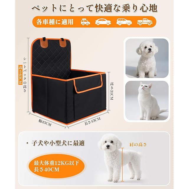 【愛犬との旅が最高の思い出に-毎日のドライブを『特別な時間』に】寸法は43x43x31cmで、チワワ、トイプードル、パグ、柴犬などの子犬~小型犬に最適です。助手席はもちろん、後部座席にも設置可能。愛犬が車に安全に乗るためのグッズとして、また長距離移動時の犬 ドライブベッドとしても活躍し、愛犬との素敵なドライブをサポートします。