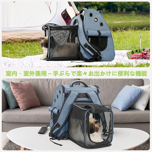 【ハウス型ネコリュック・大空間】普通の手提げ・リュックだけでなく、ペット キャリー リュックの後部を開けて、更に多くの空間を拡張し、ペットハウスとしても使えます。メッシュなので通気性も良い、ペットがバッグの中でのんびりに過ごせます。猫キャリーバックの正面と両側が開けます、ペットの出し入れも簡単!