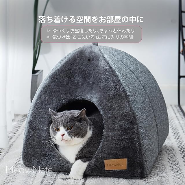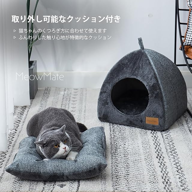 MeowMate 猫のベッド テントタイプ クッション付き グレー ドーム型 2WAY キャット 猫用ハウス 隠れ家 かわいい