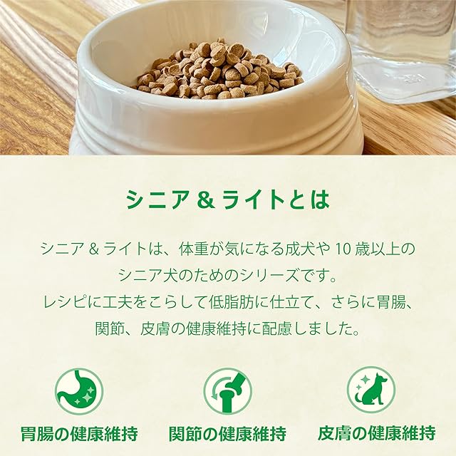 ✅【シニア期に気になる症状に配慮】 (1)胃腸の健康維持:乳酸菌配合で腸内最近のバランスを整えます。(2)関節の健康維持:低脂肪・低カロリーで体重管理に配慮し、グルコサミンとコンドロイチン配合により健康な関節の維持をサポートします。(3)皮膚んp健康維持:健康な皮膚のために、オメガ‐6脂肪酸とオメガ‐3脂肪酸のバランスを調整しています。